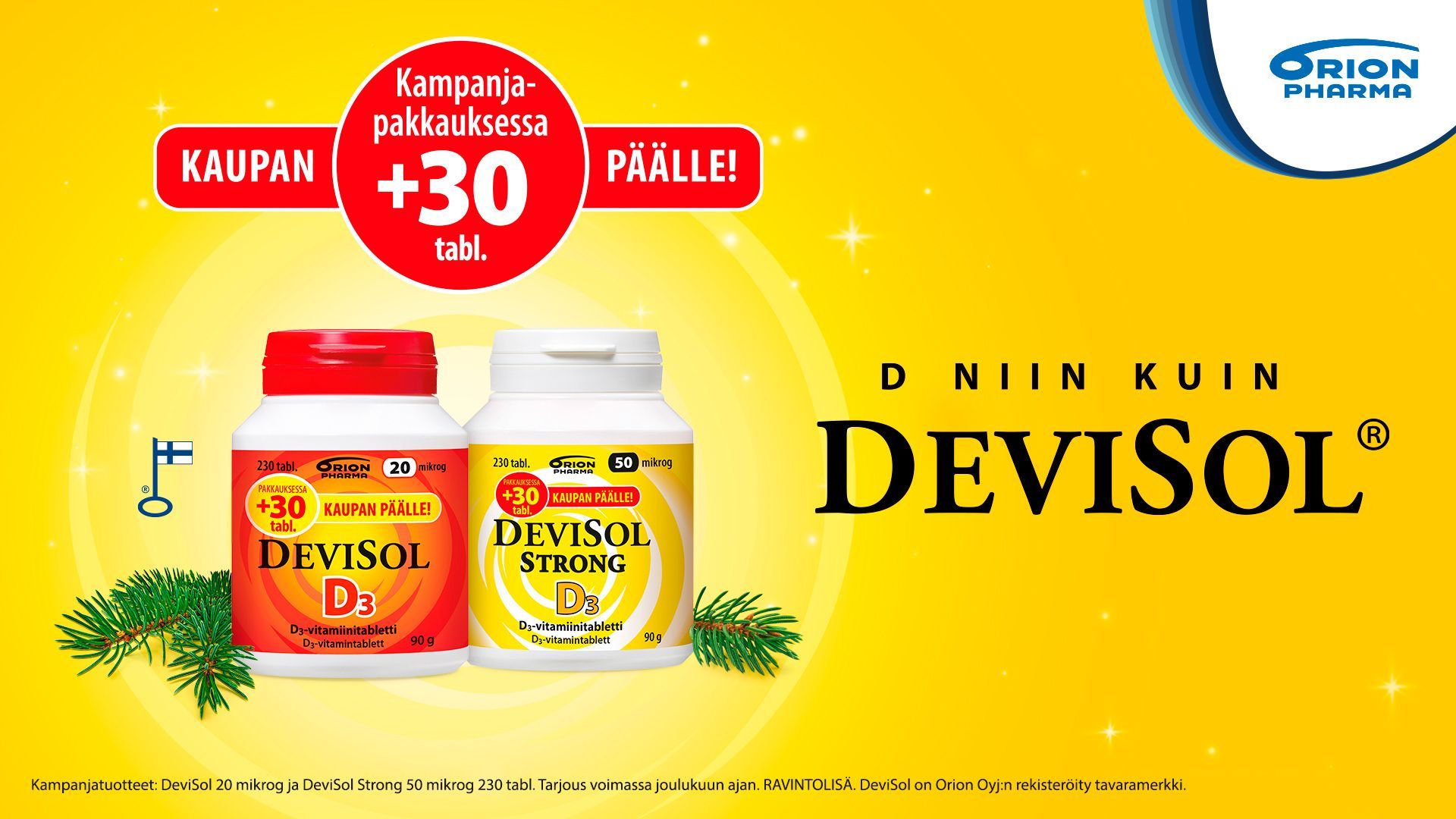 Muhkeat DeviSol-kampanjapakkaukset sisältävät 30 tablettia enemmän vastustuskykyä vahvistavaa D3-vitamiinia. Tutut sitruunaiset suosikkituotteet turvaavat D-vitamiinin saantisi myös joulurientojen keskellä.