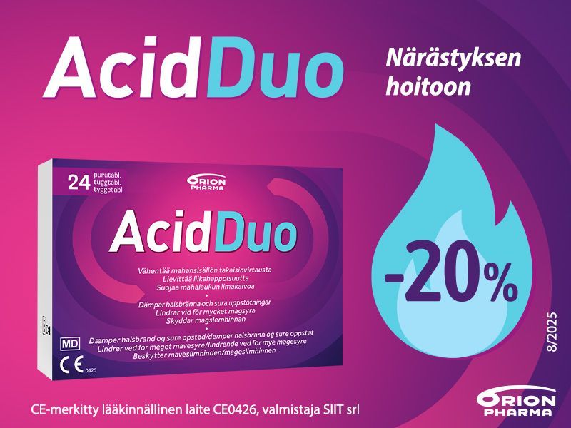 Acidduo-purutabletit ovat tammikuussa –20 % tarjouksessa! Kun hapot polttelee ja olo on raskas, Acidduo on nopea apu. Siinä on miellyttävä sitrus-mintun maku ja se löytyy lähimmästä kampanja-apteekista. Hae omasi ja johan helpottaa!