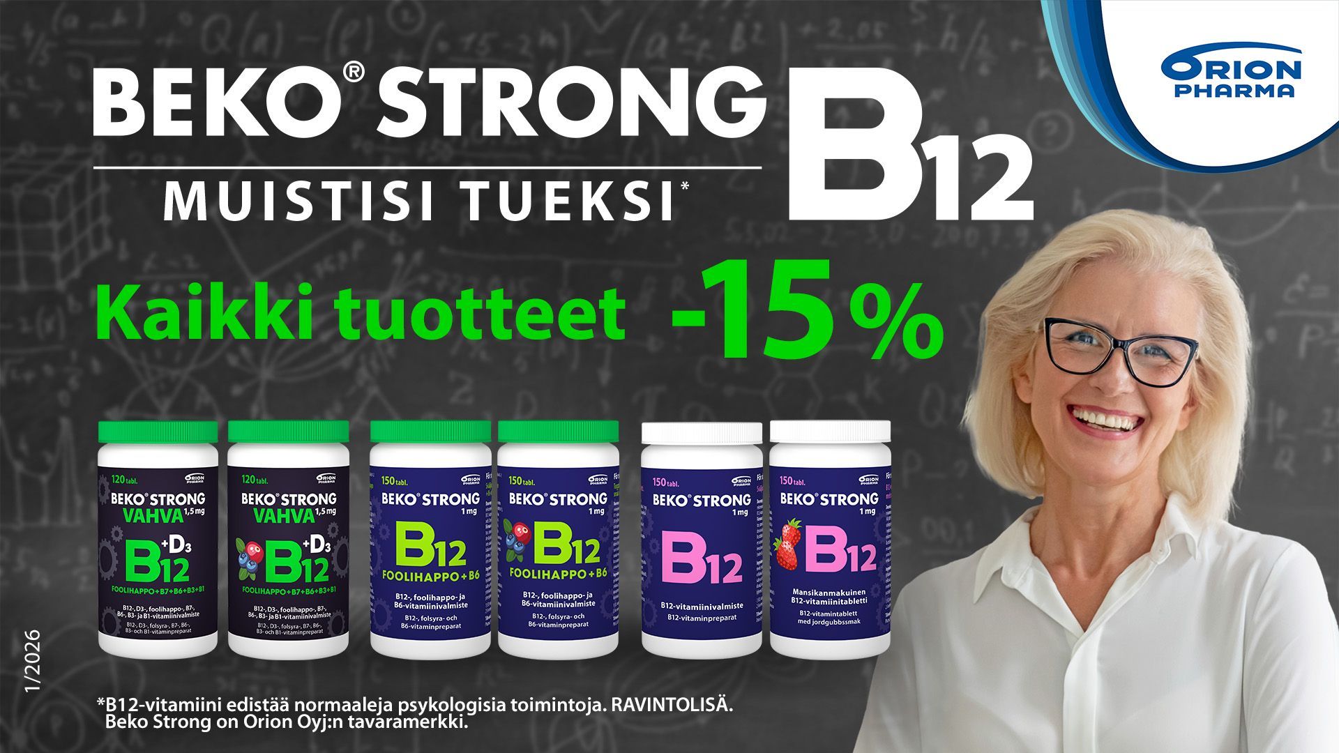Beko Strong B12 VAHVA on monipuolinen B12-vitamiinivalmiste, joka sisältää myös D-vitamiinia. Kaikki suositun Beko Strong B12 -sarjan tuotteet -15 % maaliskuun ajan.