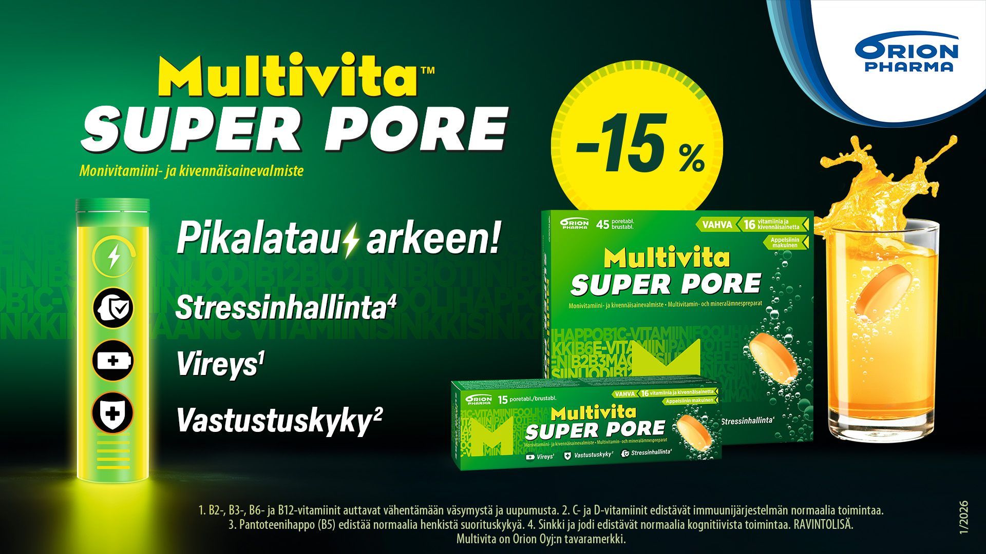 Vahva ja energisoiva⚡Multivita Super Pore antaa pikalatauksen arkeen! Huhtikuussa Multivita Super Pore -15 % kampanjatarjouksessa. Multivita Super Pore on raikkaan appelsiinin makuinen monivitamiiniporetabletti, joka sisältää erityisen runsaasti päivittäin tarvittavia vitamiineja ja hivenaineita. Hae omasi apteekista ja pysy huipputehoilla!