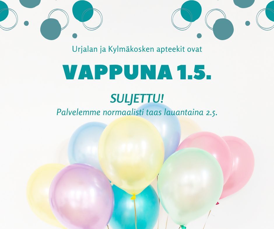 Urjalan ja Kylmäkosken apteekit ovat suljettuna vappuna 1.5.2026. Palvelemme teitä taas normaalein aukioloajoin lauantaina 2.5.2026